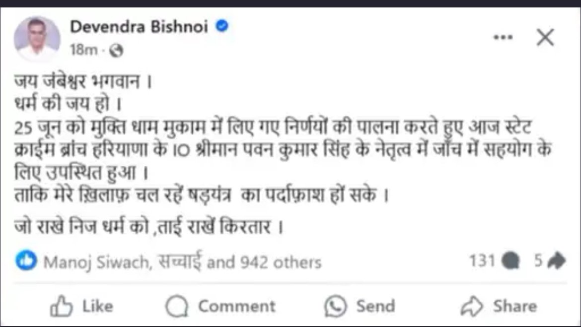 गिरफ्तारी के बाद बूड़िया ने अपने सोशल मीडिया अकाउंट पर लिखा- 25 जून को मुक्ति धाम मुकाम में लिए गए निर्णयों का पालन करते हुए आज स्टेट क्राइम ब्रांच हरियाणा के आईओ पवन कुमार सिंह के नेतृत्व में जांच में सहयोग के लिए उपस्थित हुआ, ताकि मेरे खिलाफ चल रहे षड्यंत्र का पर्दाफाश हो सके।