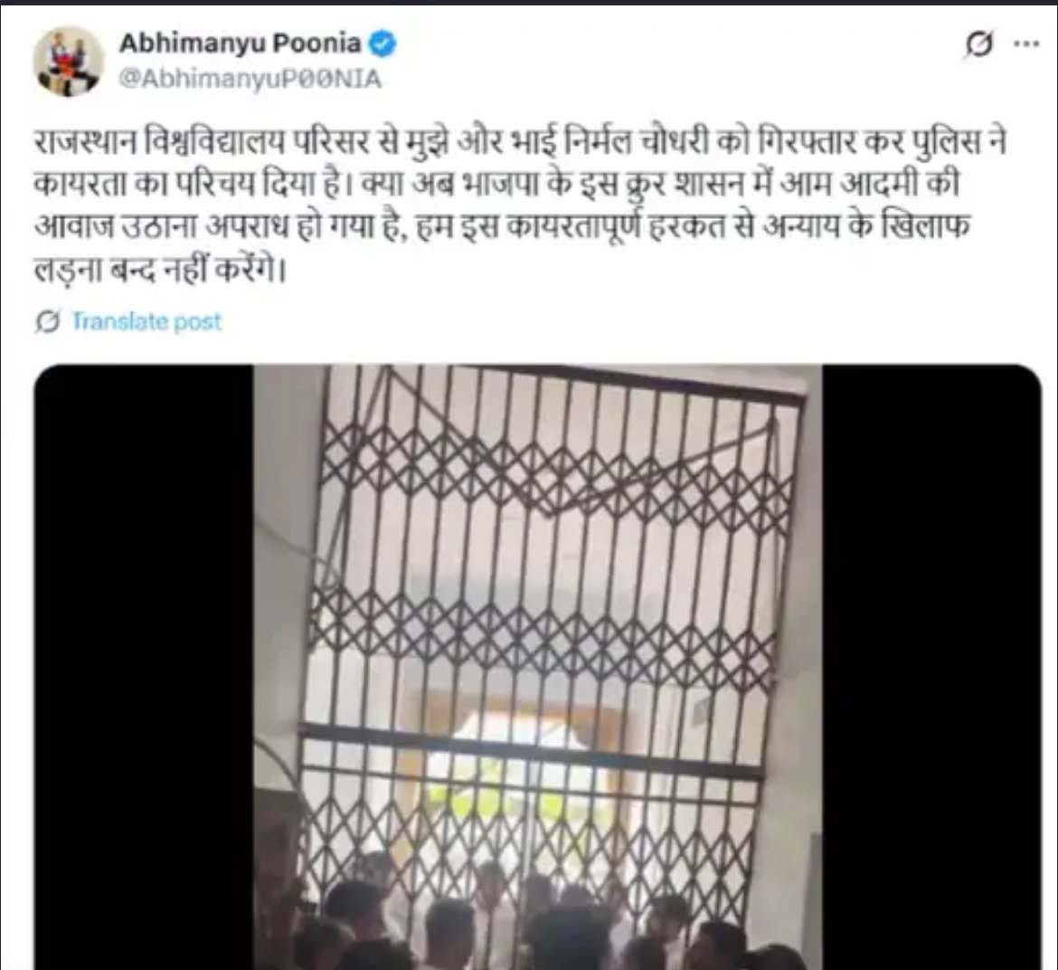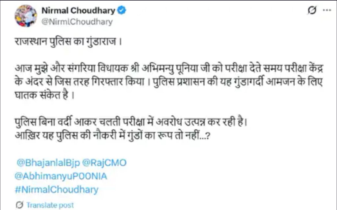 सोशल मीडिया X पर छात्र नेता निर्मल चौधरी ने लिखा- राजस्थान पुलिस का गुंडाराज-