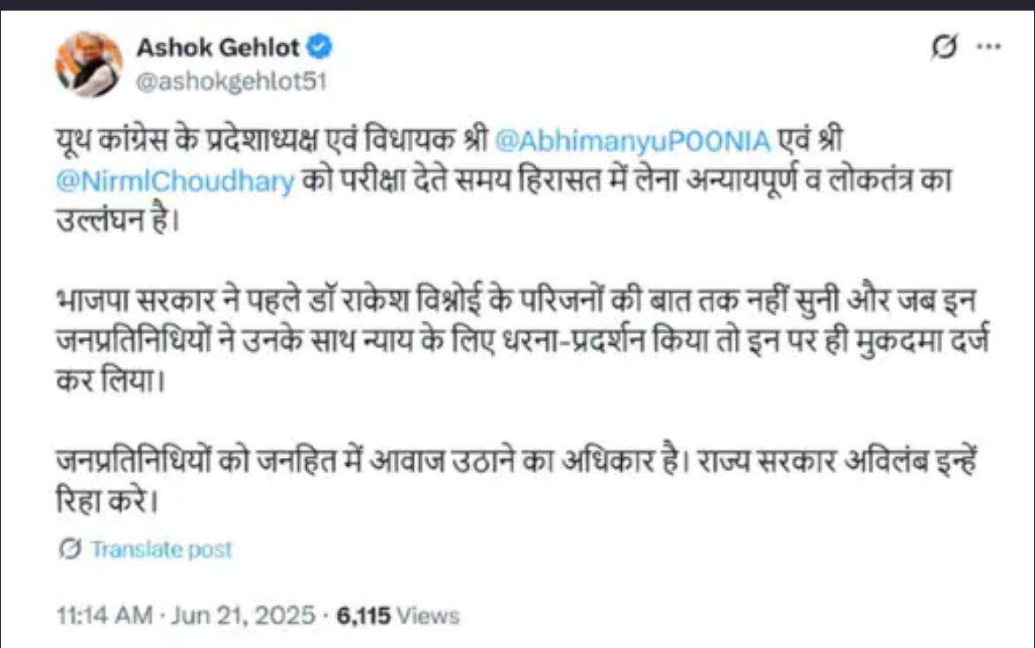 पूर्व मुख्यमंत्री अशोक गहलोत की X पर पोस्ट