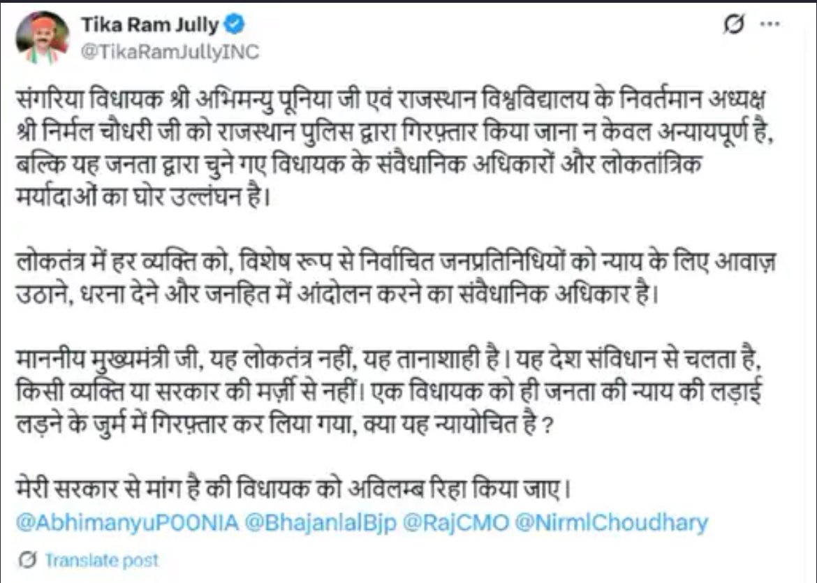 प्रतिपक्ष नेता टीकाराम जूली की X पर पोस्ट