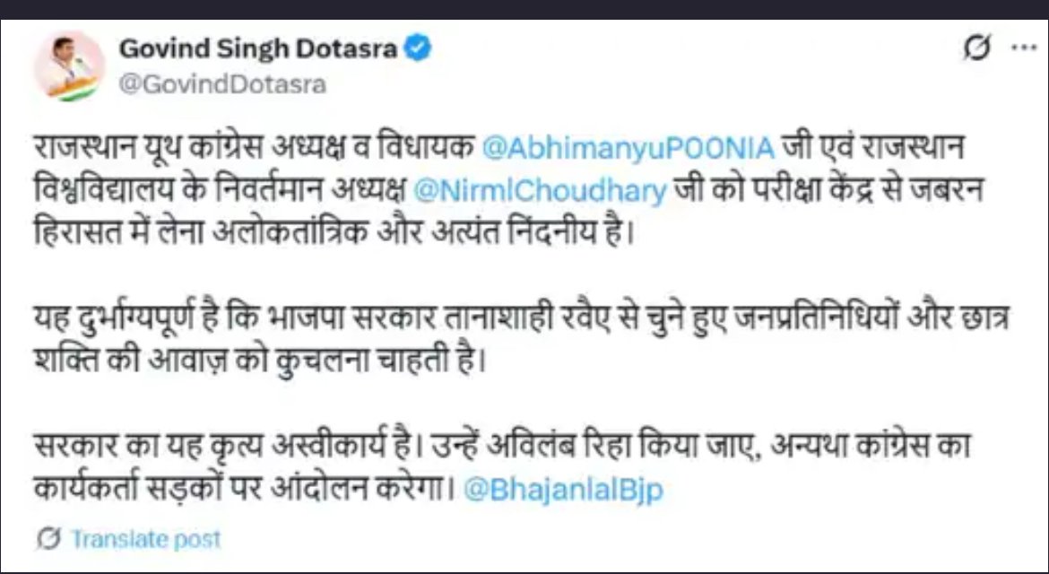 पीसीसी चीफ गोविंद सिंह डोटासरा की X पर पोस्ट