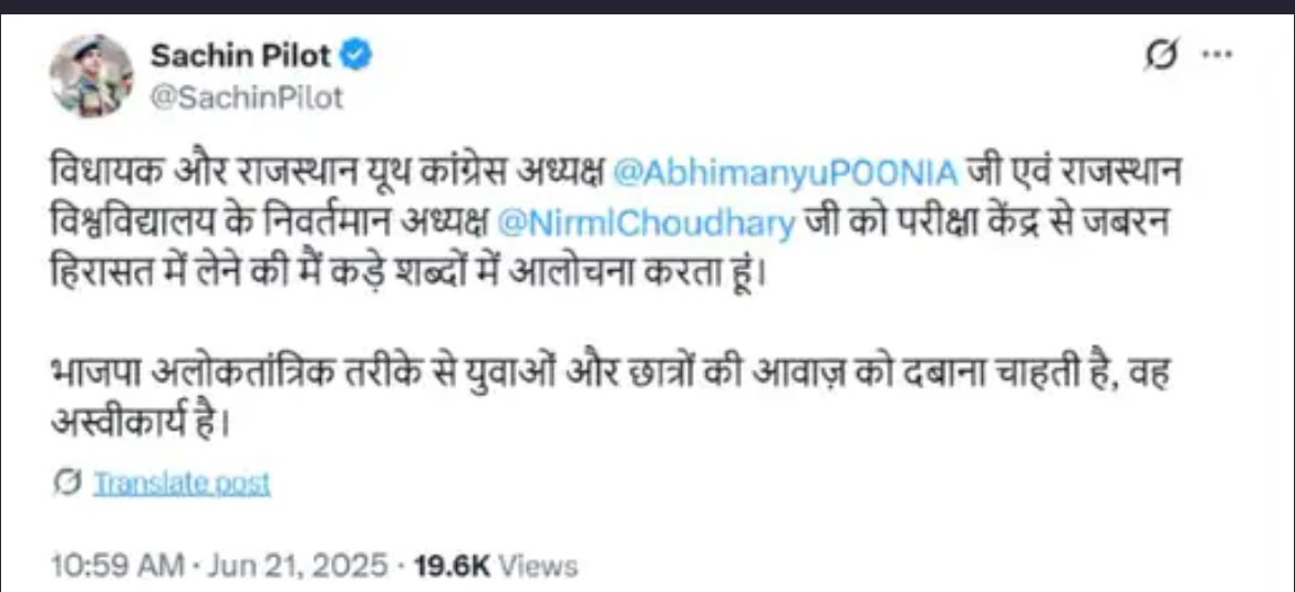 सचिन पायलट की X पर पोस्ट